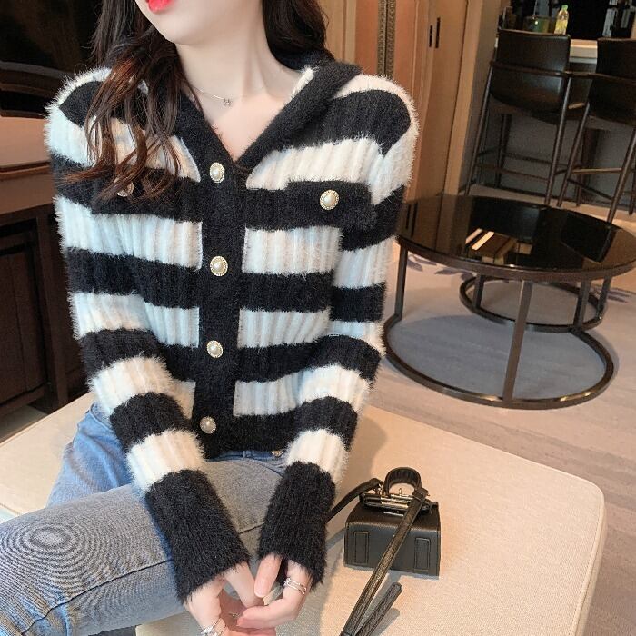 ストライプセーター ショートオータムウィンターフードカーディガン 大人ガーリー スウィート キュート カジュアル 秋物 冬物 ガールズファッション99578579606