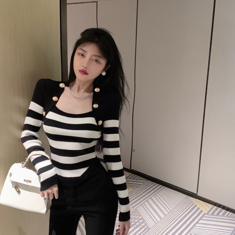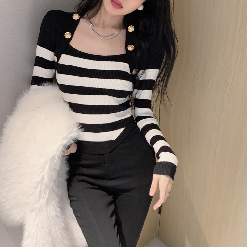 スタンダードカラーストライプセーター オータムウィンター長袖スリーブ ロング レトロ 秋物 冬物 スクウェア ガールズファッション31266485589