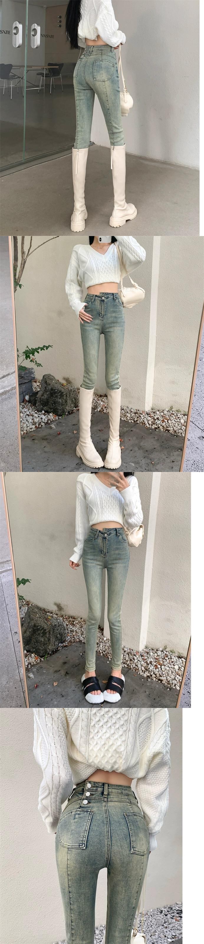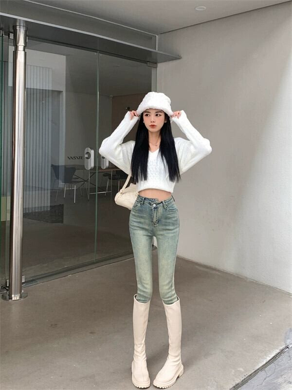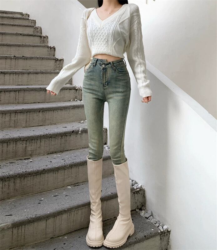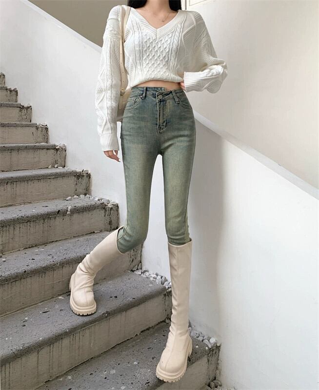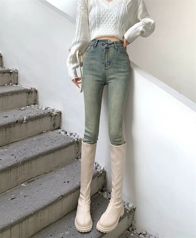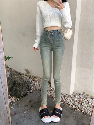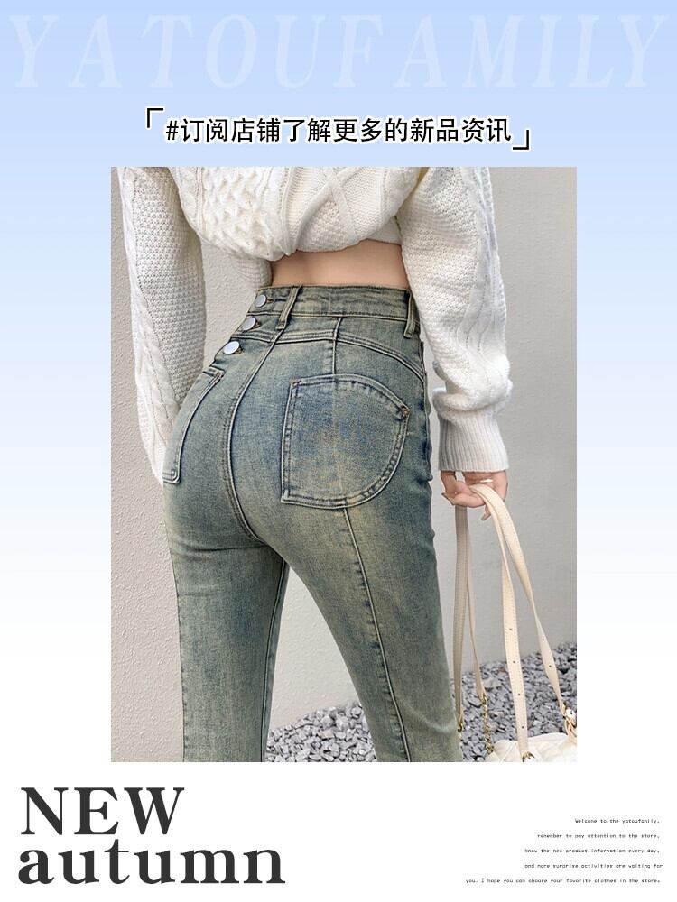 不規則なハイウエスト ジーンズの女性、秋の青いズボン、タイトな伸縮性のあるレギンス、多用途のペンシル パンツ ブルー エラスティック オータム 秋物 ガールズファッション41841832199