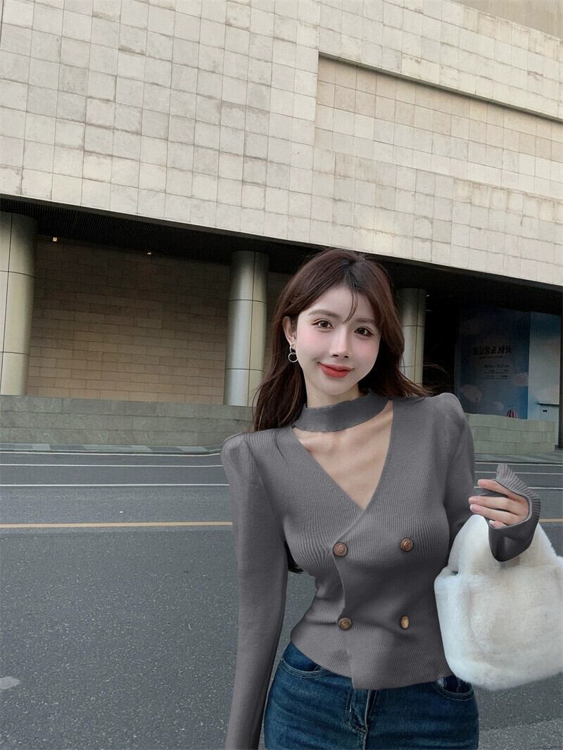 気質ホルターネック中空 V ネックセーター女性春ニッチ黒長袖トップタイトなショートボトムセーター ロング ブラック スプリング 春物 Vネック ガールズファッション63655045156