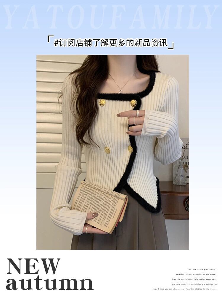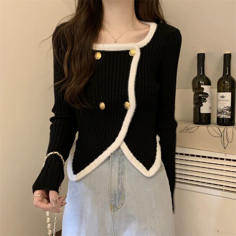 Maomao カラーブロックスクエアネックセーター女性春フレンチショート暖かいセータータイトな長袖ボトミングトップ ロング スプリング 春物 スクウェア ガールズファッション37850065999