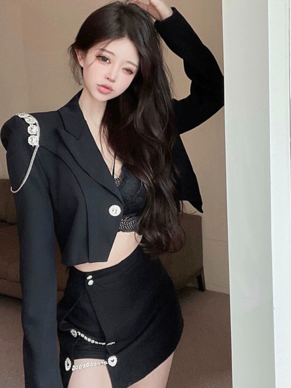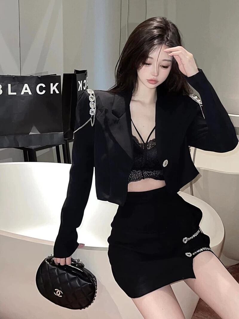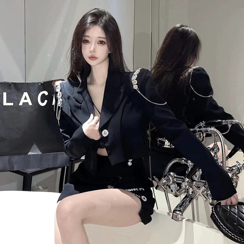重工業ダイヤモンドラペルショートコート女性秋黒小さなスーツハイエンドルーズ長袖カーディガントップトレンディな ロング ブラック オータム 秋物 ガールズファッション97688725136