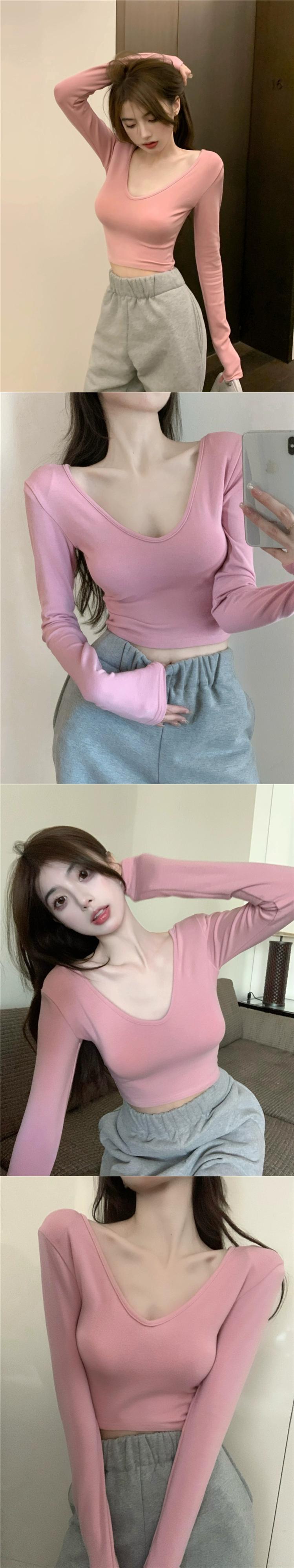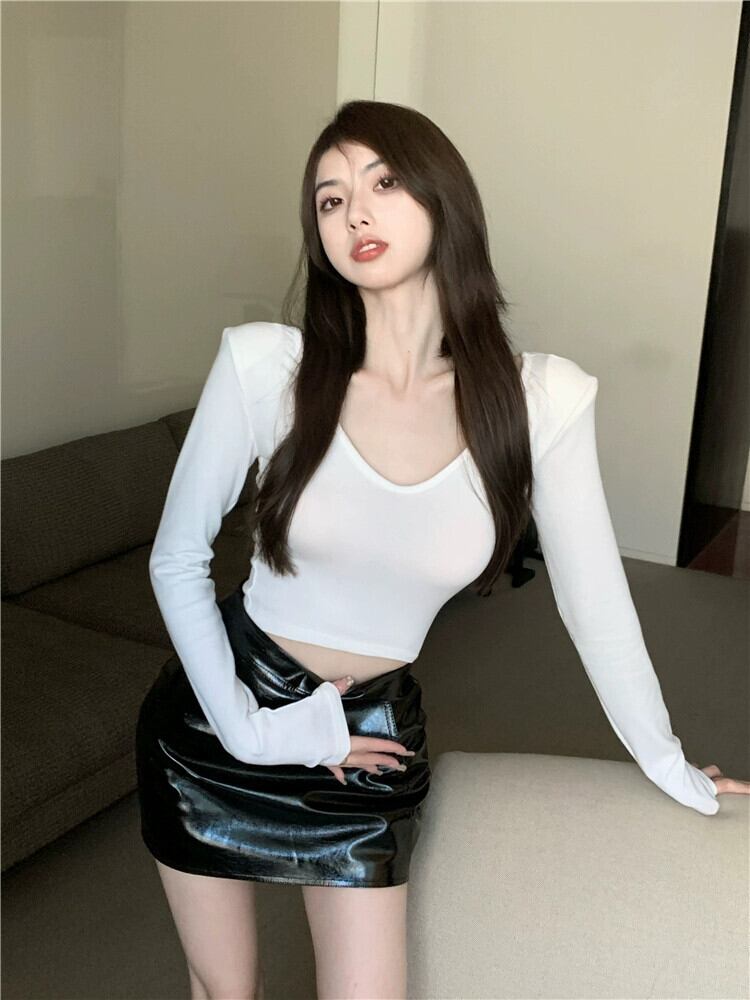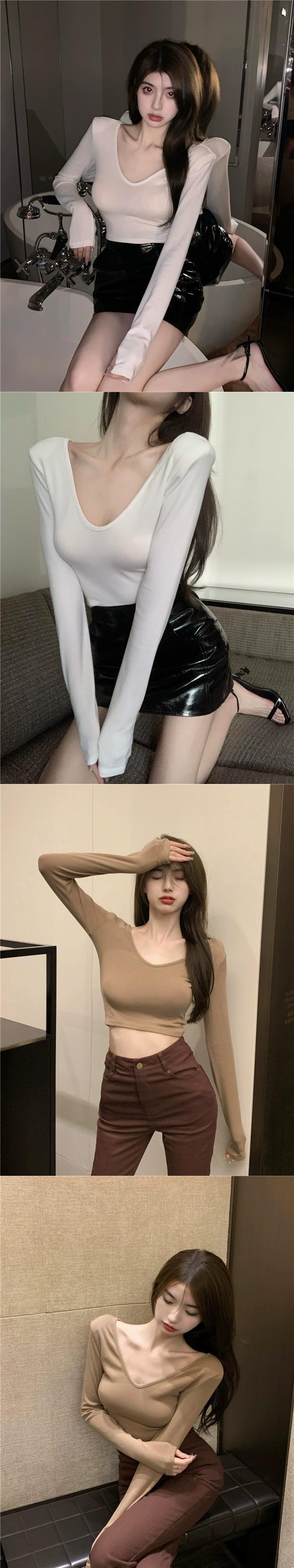 肩パッド入り V ネック トップス レディース、秋デザイン、ニッチなインナーウェア、ショートボトム シャツ、鎖骨を見せたい純粋な欲求、へそ出し長袖 T シャツ ロング オータム 秋物 Vネック Tシャツ ピュア ガールズファッション29502615020