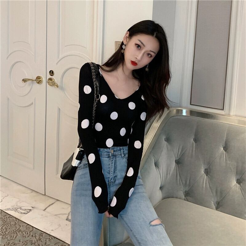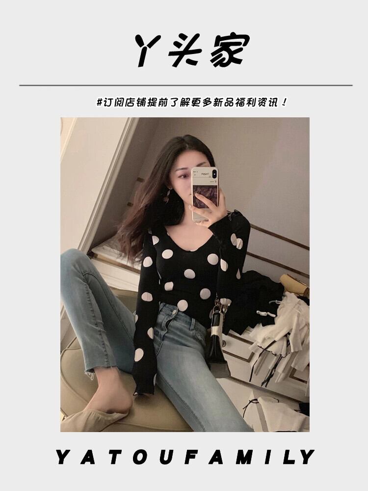 Vネックポルカドット長袖Tシャツレディース秋スリムフィットストレッチインナーボトムシャツフレンチニッチ万能シックトップトレンド ロング オータム 秋物 ガールズファッション8192787781