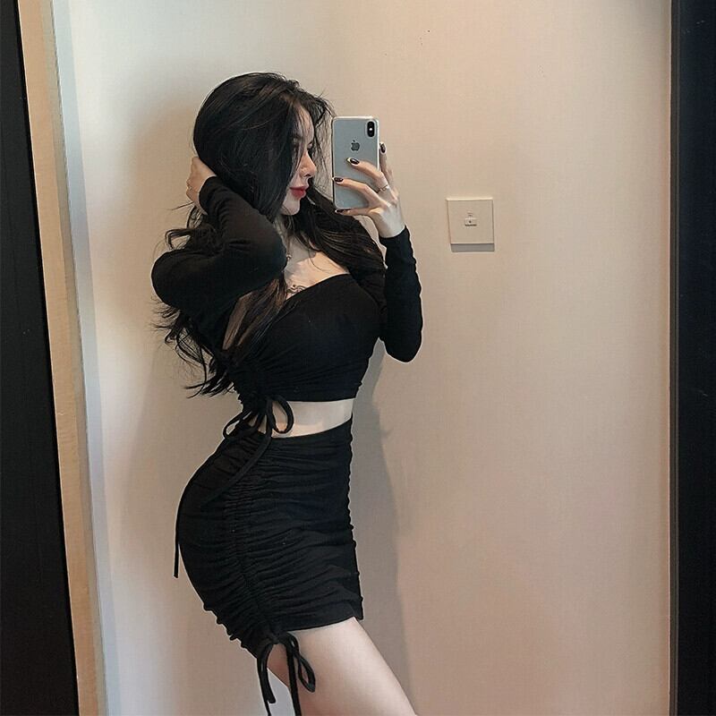 ホットセクシーなファッションツーピーススーツ女性の秋長袖カーディガンショール + ストラップウエストレスチューブトップスカートヒップカバーショートスカート ロング オータム 秋物 ガールズファッション24243824478