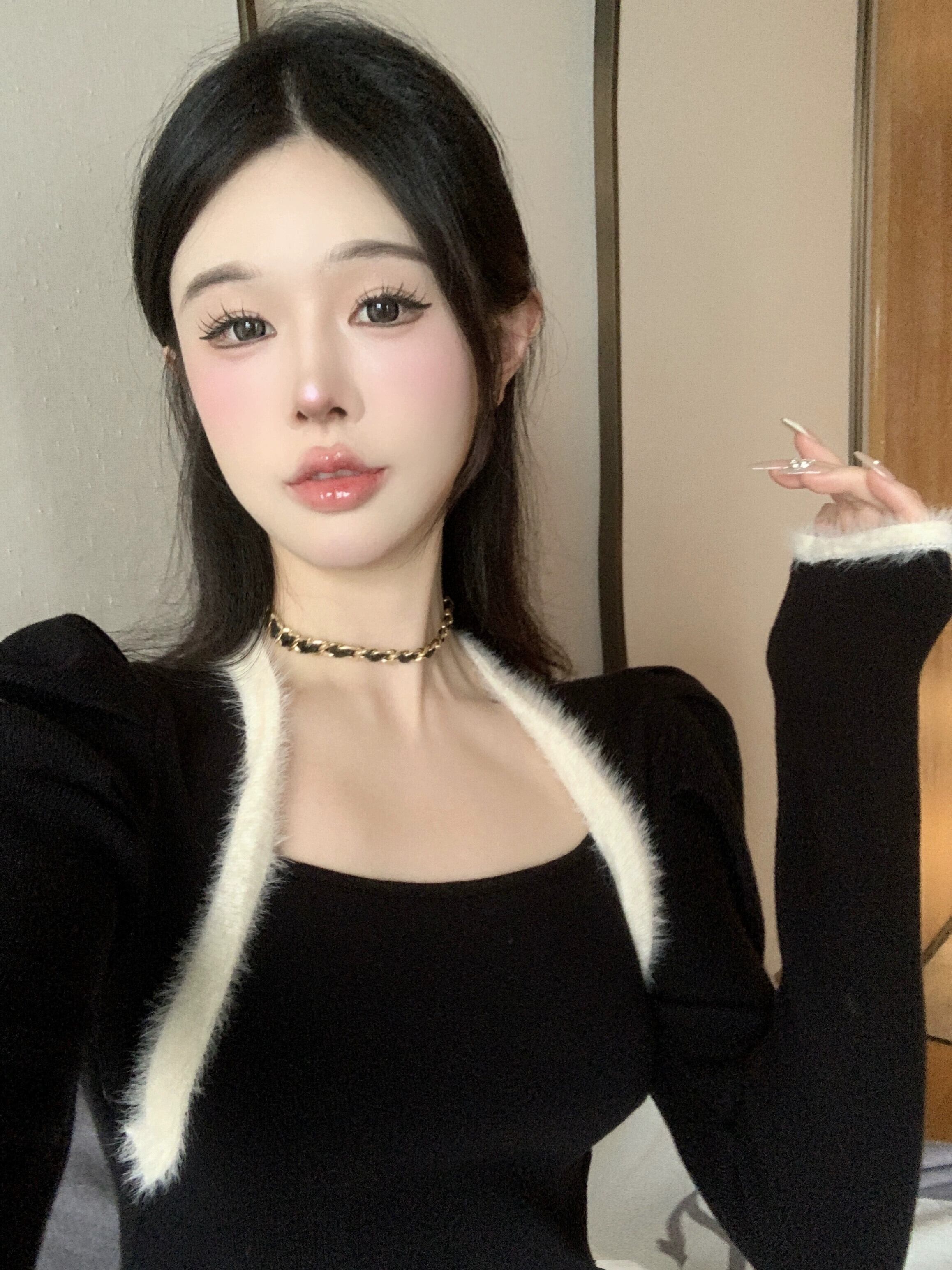 レトロブラックスクエアネックセーターレディース春ホットガールタイトパフスリーブトップショートボトミングセーター スプリング 春物 スクウェア ガールズファッション48669106040