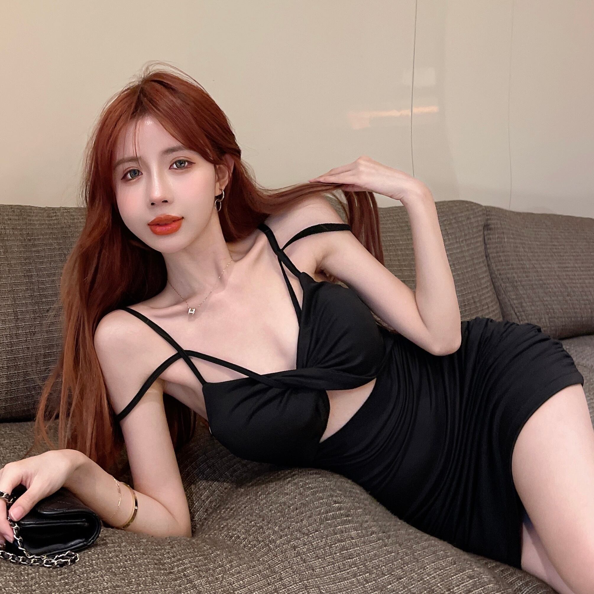 サスペンダードレス女性夏インターネットセレブハイウエスト中空ヒップスカート純粋な欲望気質スリムプリーツリトルブラックスカート ハイウェスト サマー 夏物 ピュア ガールズファッション4514999464