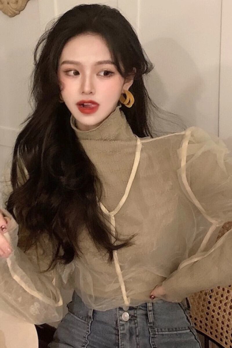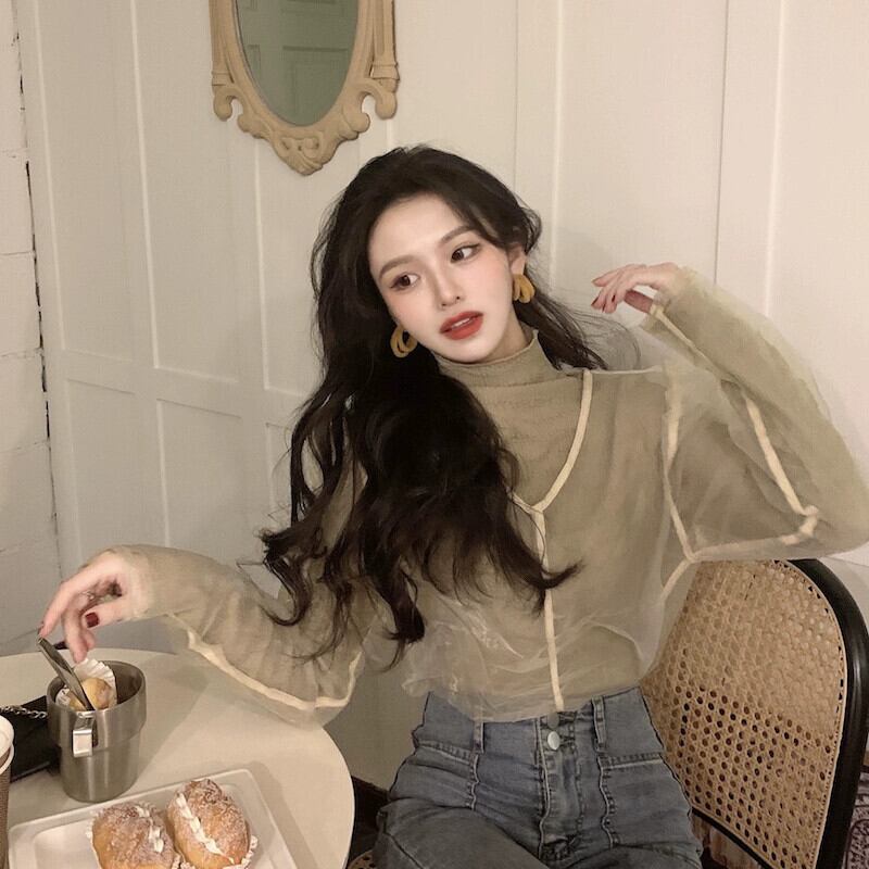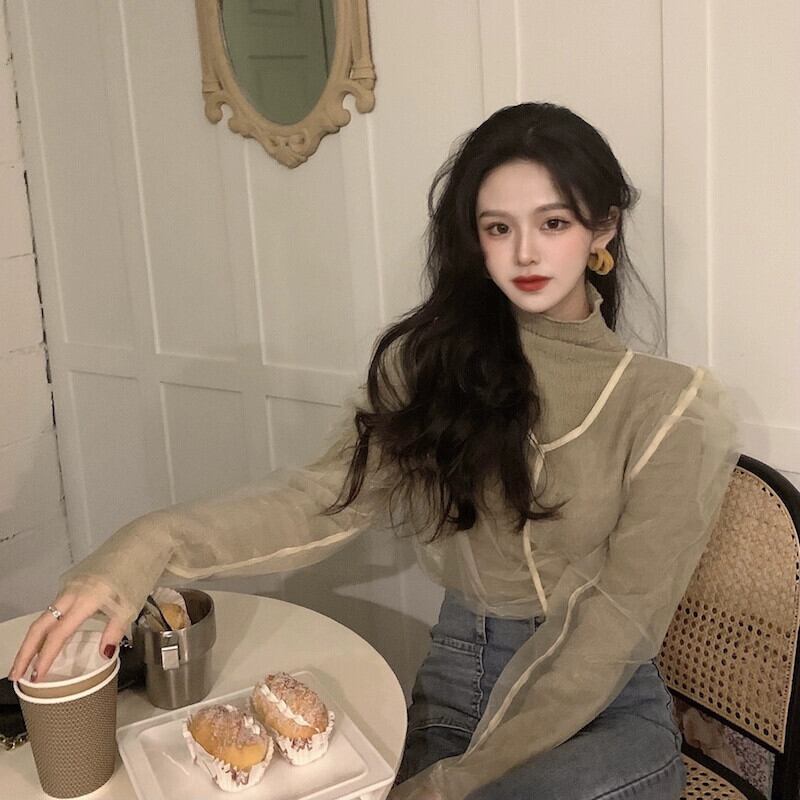 長袖 Tシャツの女性の春の新デザインメッシュパフスリーブボトリングシャツインネットセレブスーパーインナートップトレンド ロング スプリング 春物 ガールズファッション67855319017