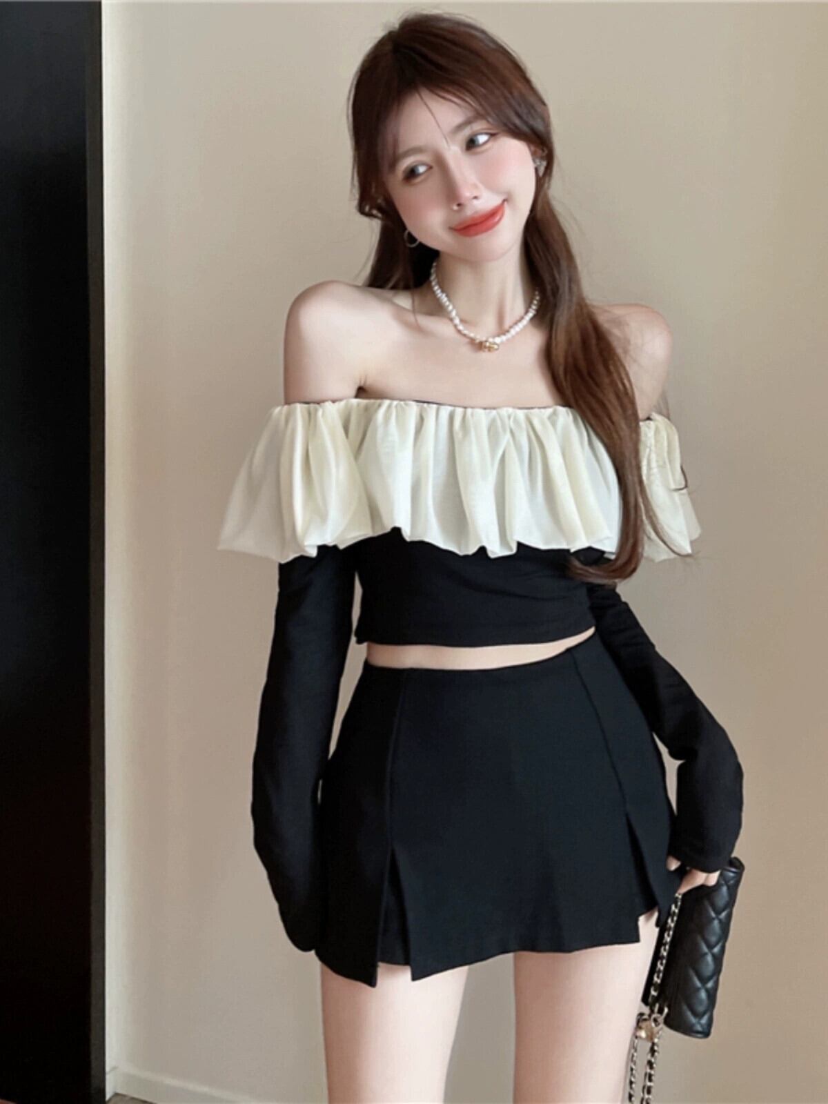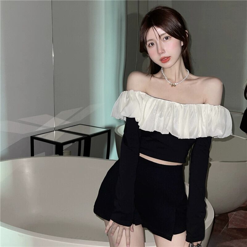 コントラストカラーのフリルワンショルダーTシャツレディース秋の純粋な欲望インナーショートトップハイエンド長袖ボトリングシャツ ロング オータム 秋物 ピュア ガールズファッション5648617032