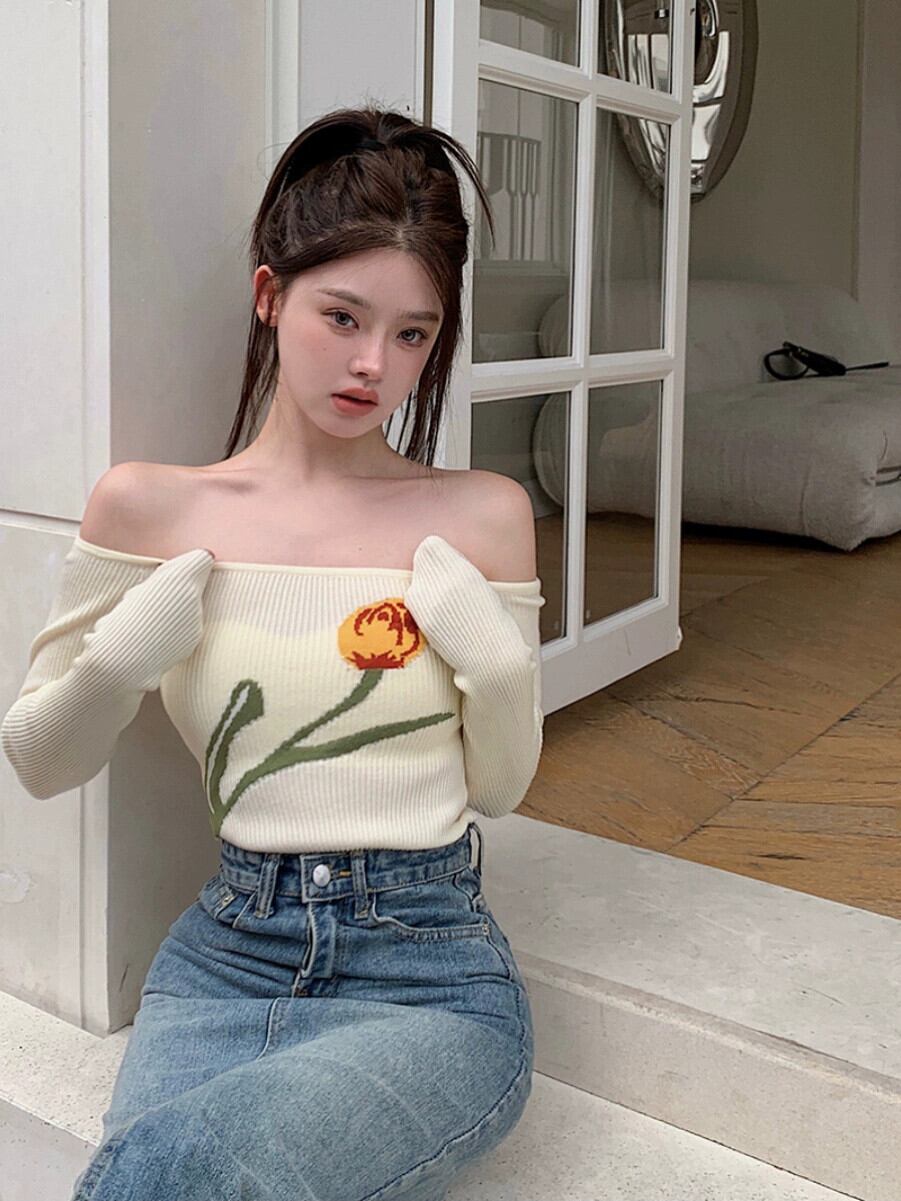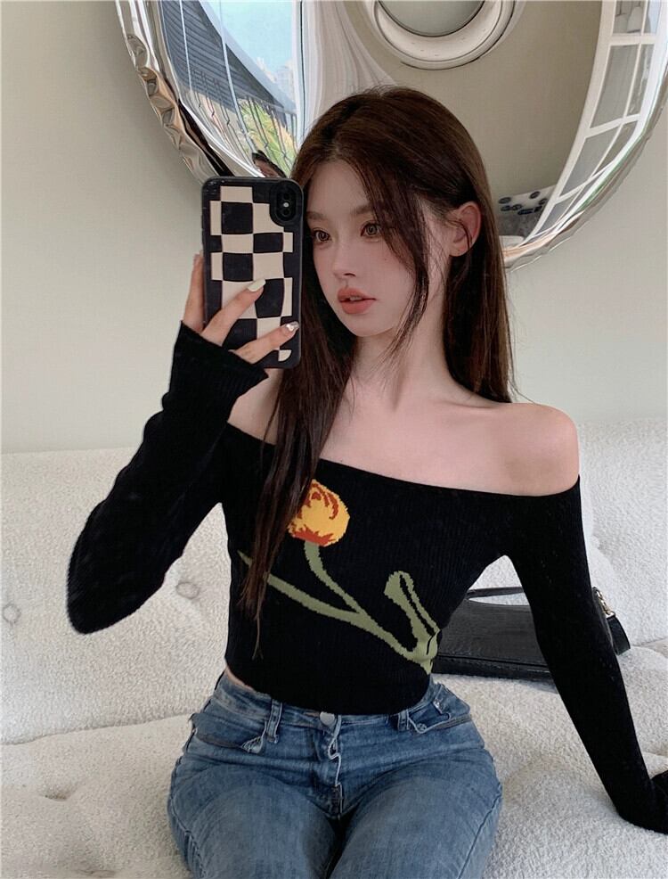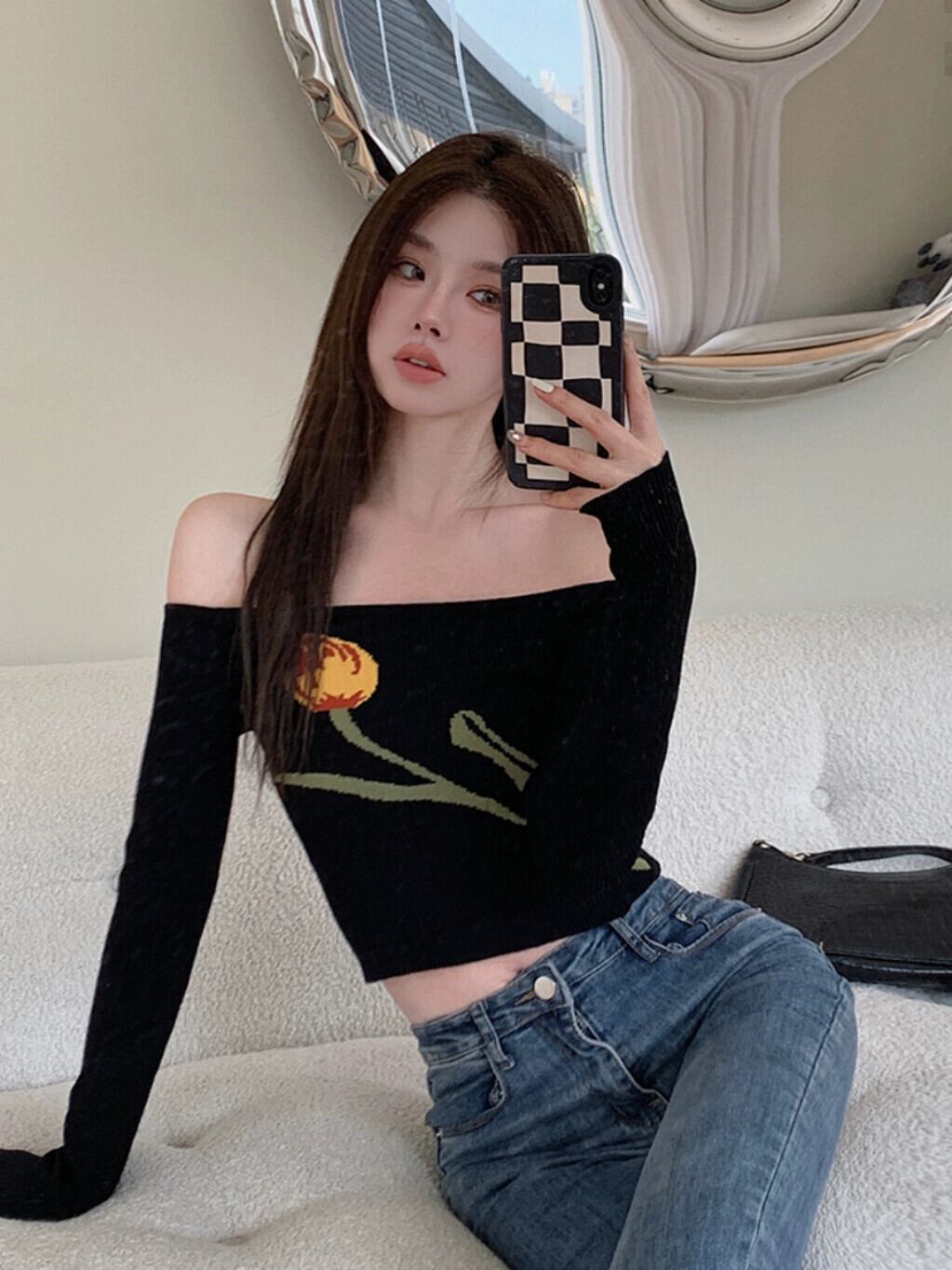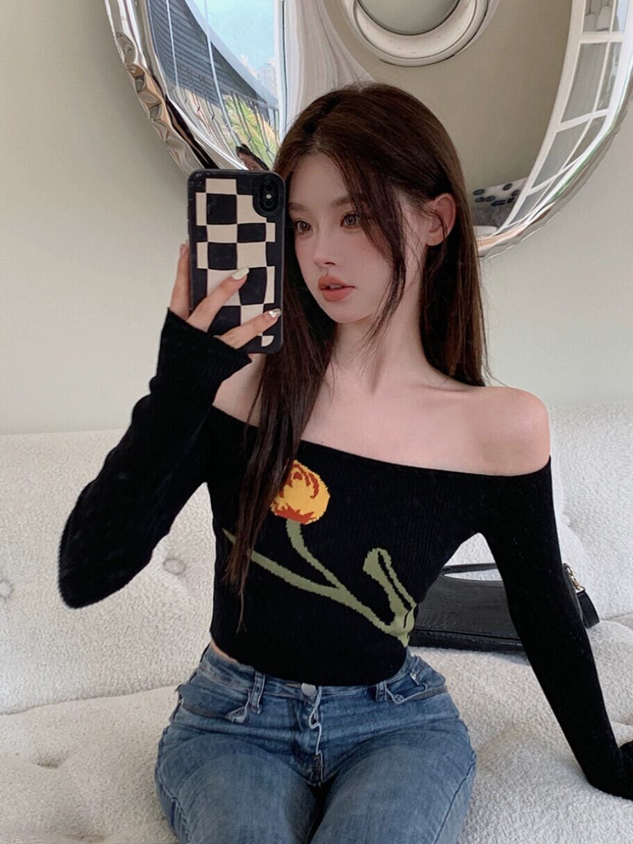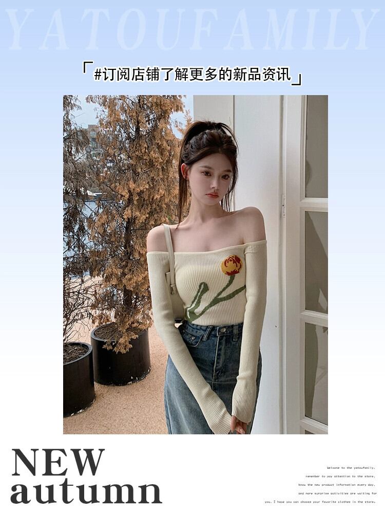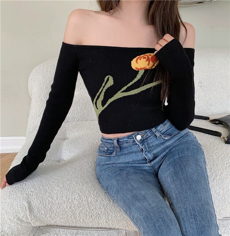セクシーなジャカードデザインワンショルダー長袖ニットボトムシャツレディースフィットショートセータートップ秋 ロング オータム 秋物 ガールズファッション86417770691