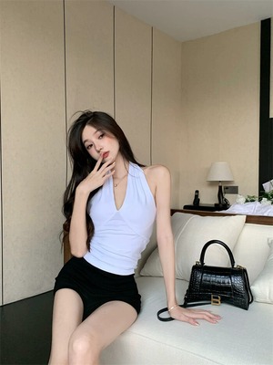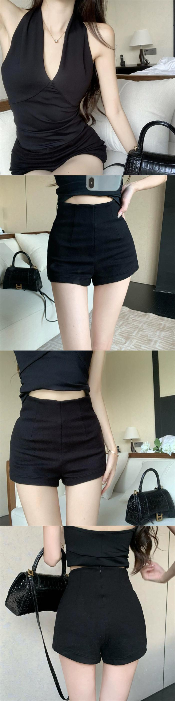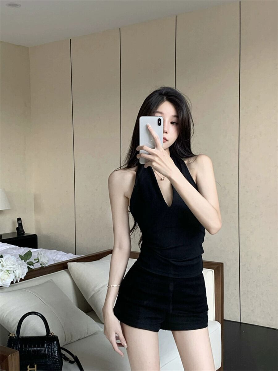 純粋な欲望のファッションツーピーススーツ女性の夏のホルターネック V ネックキャミソールハイウエスト黒のタイトなショーツ ハイウェスト ブラック サマー 夏物 ブルマー Vネック ガールズファッション7302498776